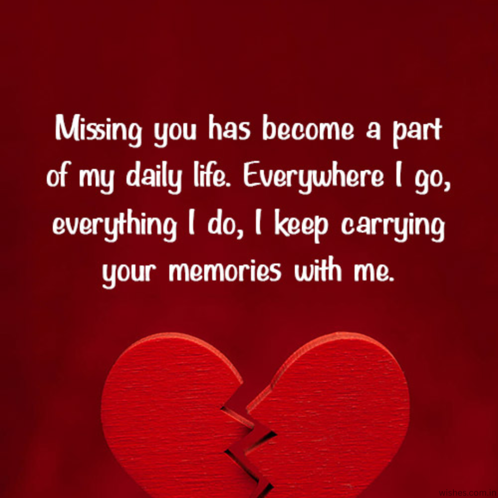 | 💔 Missing you has become part of my everyday existence; wherever I go, your memories walk with me. 💔 |