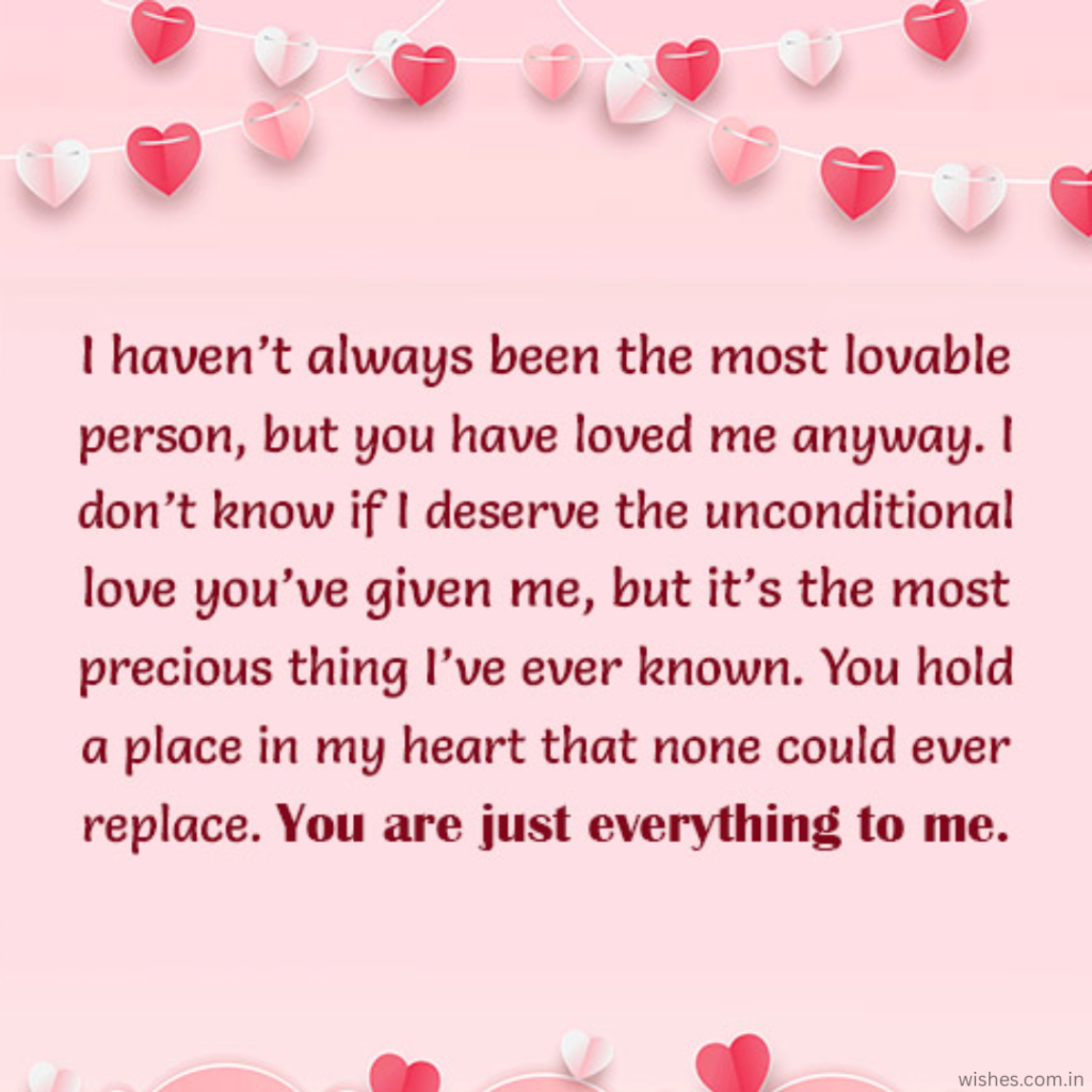 | 🌹 I haven’t always been the most lovable person, but you have loved me anyway. I don’t know if I deserve the unconditional love you’ve given me, but it’s the most precious thing I’ve ever known. You hold a place in my heart that none could ever replace. You are just everything to me. 💞 |